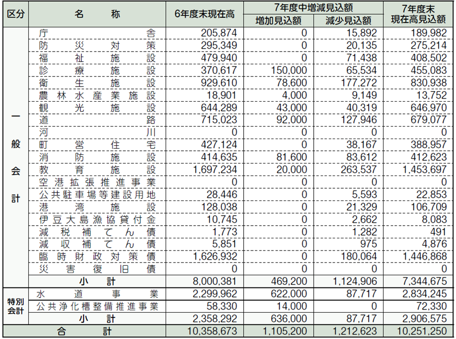 令和7年度末残高見込みは、前年度と比較すると1億742万円減少し、102億5125万円となり、住民1人当たりでは149万3916円です。類似団体では住民1人当たり81万247円ですので、大島町は町債(借入金)がかなり多い状況であるといえます。