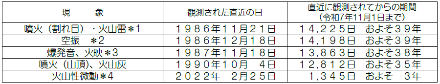 全島民約1万人が島外に避難した1986年の噴火から39年が経過しました。その後も小規模の噴火は発生しましたが、現在の火山の様子は「火山性微動は発生しておらず、ただちに噴火が発生する兆候は認められません」(令和7年9月、気象庁伊豆大島火山防災連絡事務所)と、顕著な火山現象は観測されていません。しかし、1986年の噴火は昭和49年以来約12年ぶり、割れ目噴火は565年ぶりに発生し火山活動は人間にとっては長い休止期間を経てから活発になることもあるようです。そこで噴火に伴う火山現象がいつ発生したのか見てみます。