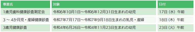 身体計測が出来、日頃の子育ての中からでてくる疑問や心配事などに保健師・助産師・管理栄養士・歯科衛生士が応じます。母子健康手帳を持参してください。