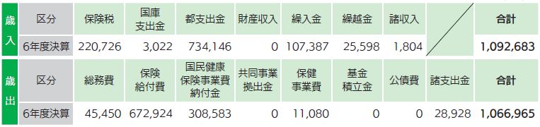 令和6年度の国民健康保険の加入者は1,476世帯2,092人で、一人当たりの国民健康保険税額(後期高齢者支援分、介護納付金分を含む)は105,510円、一人当たりの保険給付費は321,665円でした。