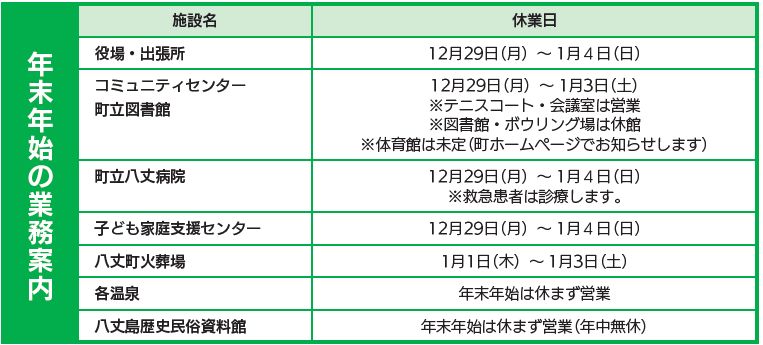 くらし 年末年始の業務案内 20/49 前の記事 次の記事 発行日 : 2026年01月01日 自治体名 : 東京都八丈町 広報紙名 : 広報はちじょう 2026年1月号 ※先月の広報に記載された[火葬場の休業日]に誤りがありました。正しくは上記表の内容をご覧ください。 Tweet シェアする 年末年始のごみ収集 環境だより