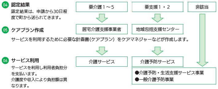 認定調査/主治医意見書:役場の調査員が自宅に訪問し、心身の状況について本人や家族から聞き取り調査などをおこないます。また、主治医に心身の状況について意見書を作成してもらいます。