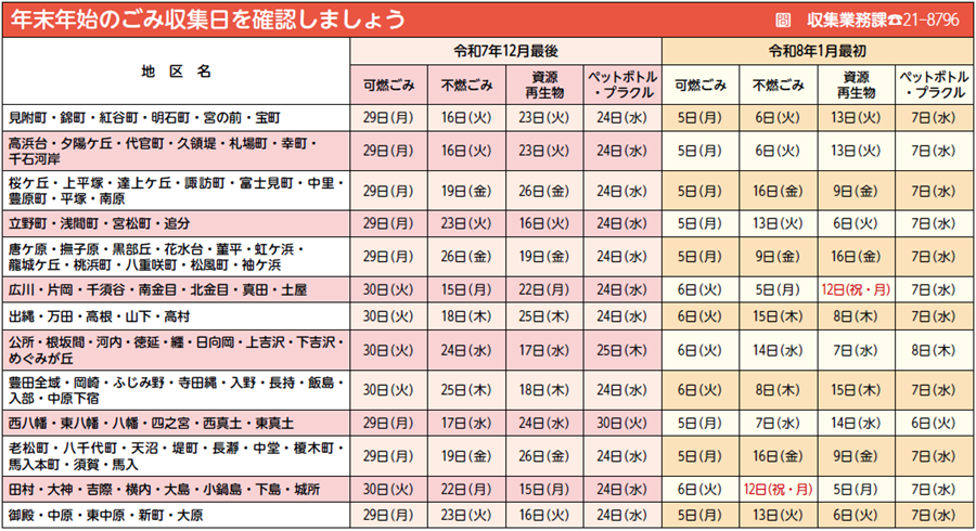 くらし 年末年始のごみ収集日を確認しましょう 8/22 前の記事 次の記事 発行日 : 2025年12月05日 自治体名 : 神奈川県平塚市 広報紙名 : 広報ひらつか 令和7年12月第1金曜日号 持ち込む場合は、事前にお問い合わせください Tweet シェアする (ご意見をお寄せください)パブリックコメント お知らせ