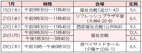 応募:土・日曜日と祝日を除く各開催日の3日前までに、電話で、福祉会館【電話】33-3100へ。