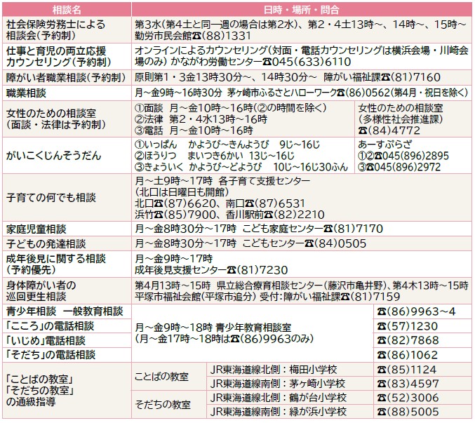 くらし くらしの相談窓口 21/22 前の記事 次の記事 発行日 : 2026年01月01日 自治体名 : 神奈川県茅ヶ崎市 広報紙名 : 広報ちがさき 2026年(令和8年)1月1日号 Tweet シェアする 教育委員会×フリースクールなど「相談会で不登校支援情報を」 その他のお知らせ (広報ちがさき 2026年(令和8年)1月1日号)