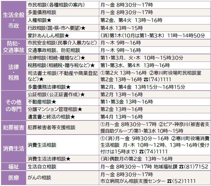 くらし くらしの相談窓口 28/29 前の記事 次の記事 発行日 : 2025年10月01日 自治体名 : 神奈川県茅ヶ崎市 広報紙名 : 広報ちがさき 2025年(令和7年)10月1日号 ★予約制 問合せ: (消)消費生活センター【電話】81-7130 ・明記のない場合は 市民相談課【電話】81-7129 Tweet シェアする 〈市内事業者と消費者を支援〉キャッシュレスでポイント還元 その他のお知らせ (広報ちがさき 2025年(令和7年)10月1日号)