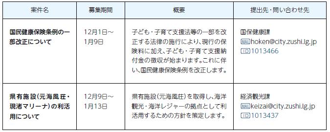 パブリックコメントとは、市の計画や制度などを決定前に公表し、市民や事業者から意見を出してもらう制度です。広く意見を募集する案件は、必ず広報ずしに掲載し、その詳細は市ホームページなどで紹介しています。また、結果は市ホームページで公表します。あなたも意見を出しませんか。