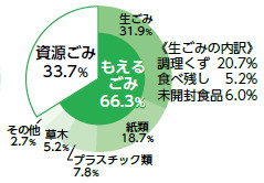 家庭から出る燃えるごみの中には、資源となる紙類や食品など、本来はごみにならないものも多く含まれています。ごみを減らすため、正しい分別や無駄のない買い物など、環境に優しい生活を心掛けましょう。