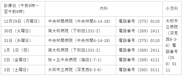 ・症状が重いときは(入院が必要と思われる場合など)…内科・小児科の当番病院(二次救急医療機関)