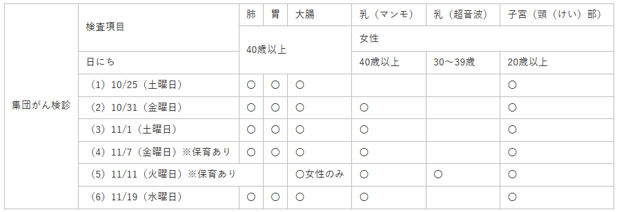 場所:(1)渋谷学習センター、(2)(3)(4)(6)保健福祉センター((2)(6)の乳(マンモ)は地域医療センター)、(5)(7)地域医療センター