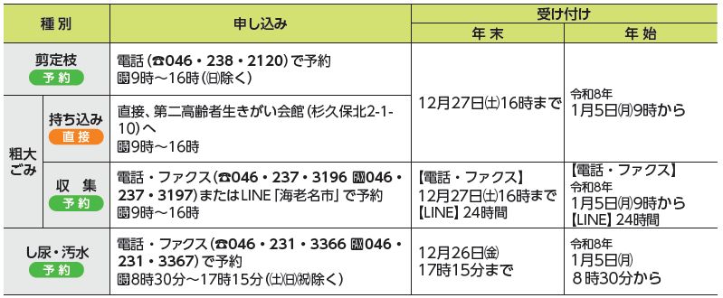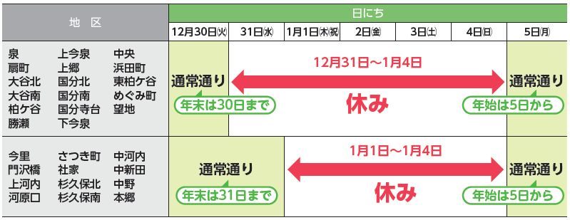 年末年始の収集日は下表のとおりです。ごみの量が1年で最も多い時期のため計画的に排出しましょう。