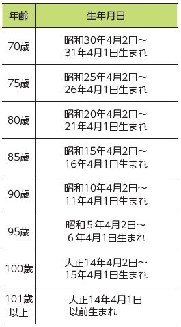(3)70歳・75歳・80歳・85歳・90歳・95歳・100歳・101歳以上の方(下表)