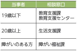 市のひきこもり相談窓口は、当事者年齢などにより異なります。20歳以上のひきこもり相談は、4月1日(火)から生活支援課が窓口です。各当事者の相談窓口は下表のとおりです。