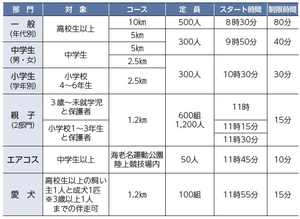 海老名運動公園周辺を走ります。ことしからコースを変更します。制限時間内に完走できる方が対象です。部門などの詳細は、市ホームページをご覧ください。海老名運動公園駐車場の利用は有料です。