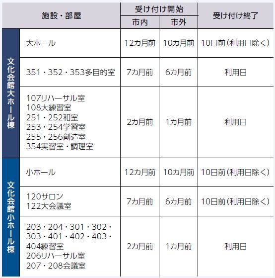 申し込みは文化会館事務室で直接受け付けます。受け付け期間は、施設・部屋により異なります。申し込み方法や空き状況などの詳細は、同会館へ問い合わせ、または同会館ホームページをご覧ください。
