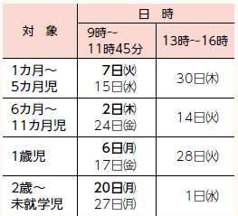 同年齢の子と保護者の交流の場です。日程は下表のとおりで、太字は助産師や保健師、栄養士が相談に応じます。1歳児は歯科相談あり。相談の受け付けは11時まで