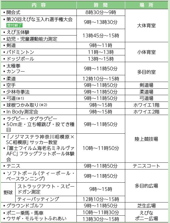 さまざまなスポーツやレクリエーションを親子で体験できます。中学生以下限定のスタンプラリーを先着で実施します。幼児・児童対象の運動能力測定や「第20回えびな玉入れ選手権大会」も同日開催します。