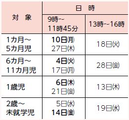 同年齢の子と保護者の交流の場です。日程は下表のとおりで、太字は助産師や保健師、栄養士が相談に応じます。1歳児は歯科相談あり。相談の受け付けは11時まで
