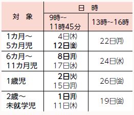 同年齢の子と保護者の交流の場です。日程は下表のとおりで、太字は助産師や保健師、栄養士が相談に応じます。1歳児は歯科相談あり。相談の受け付けは11時まで