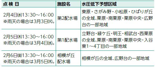 安定した水を供給するため、下表のとおり配水場電気施設の点検作業を実施します。一部の地域で水圧が低下し、水が出にくくなる場合があります。ご理解とご協力をお願いします。