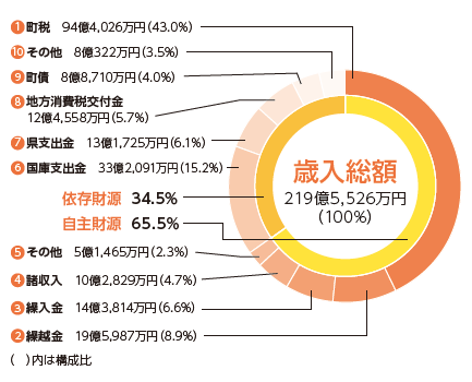 歳入は、町の1年間の収入のことです。令和6年度は前年度と比べ、7億490万円の減となりました。一般的には、自主財源の比率が高いほど国や県への依存度が減るため、財政が安定しているといわれています。令和6年度の自主財源は、前年度と比べ3億9,302万円の減となり、歳入総額に対する構成比は65.5%でした。