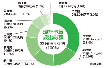 令和7年度一般会計当初予算は196億4,000万円でしたが、その後19億7,589万円を補正し、9月30日現在で221億9,028万円(繰越明許費を含む)となっています。補正内容は、定額減税補足給付金給付事業費(不足額給付分)(民生費)、道路橋りょう維持補修事業費(土木費)、スポーツ施設活性化事業費(土木費)、給食センター運営管理経費(教育費)などの追加です。