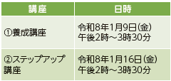 対象・定員:(1)(2)ともに、町内在住か在勤または在学の人、(2)は(1)を受講済みの人のみ 各30人(先着順)