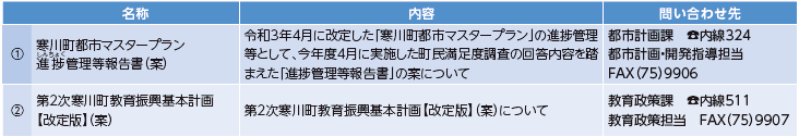 意見提出方法:資料配付・閲覧場所で配布する所定の用紙または任意の用紙に意見、住所、氏名(団体等の場合は、団体名、担当者の氏名および所在地)を記入して同所にある意見募集箱へ、または担当課へ郵送か直接、ファクスまたはEメール(町ホームページから)で