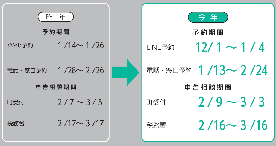 町の予約・申告期間が例年と異なるため、町での確定申告を予定している方は気を付けてください。