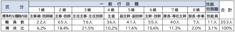 ※本町の給与条例に基づく給料表の級区分による職員数で、標準的な職務内容とは、それぞれの級に該当する職名です。