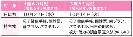 持ち物:母子健康手帳、問診票、歯ブラシ、バスタオル