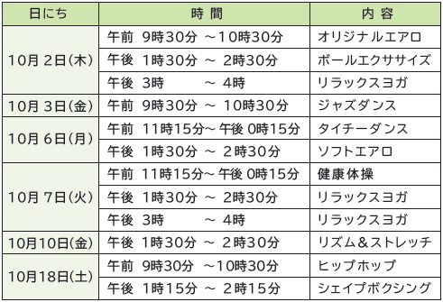 10月の「県民スポーツ月間」に合わせ、次の日程のクラスで無料体験ができます。何度でも、お気軽にお越しください。