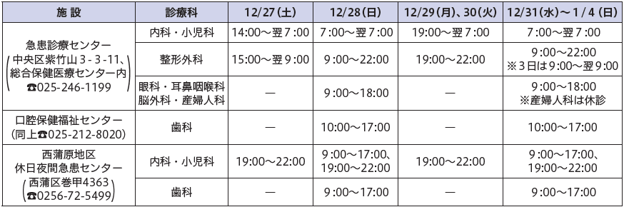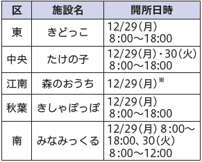 12月26日(金)以前や1月5日(月)以降の開庁状況は、事前に各施設に問い合わせてください。