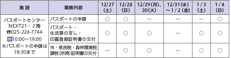 市役所や区役所などの市の業務は12月27日(土)から1月4日(日)まで休みます。一部の業務は表の通り行います。