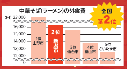新潟市はラーメンの外食費が山形市に次ぐ全国第2位。政令指定都市の中では第1位で、ラーメン好きの人が多いまちといえます。