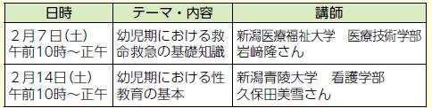 申し込み(共通):1月27日(火)午後5時までに新潟市オンライン申請システム「e-NIIGATA」または電話で中地区公民館(【電話】025-250-2910)