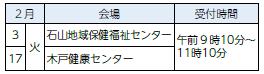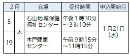 申し込み:5日(木)は石山地域保健福祉センター(【電話】025-250-2901)、19日(木)は健康福祉課地域保健福祉担当(【電話】025-250-2370)