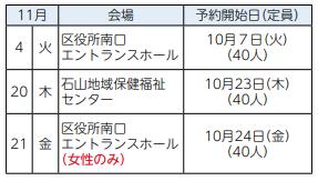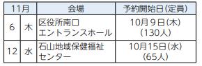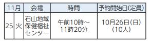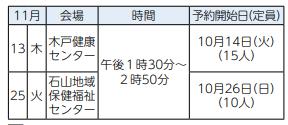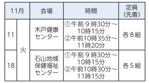 申し込み:11日(火)は健康福祉課地域保健福祉担当(【電話】025-250-2370)、18日(火)は石山地域保健福祉センター(【電話】025-250-2901)