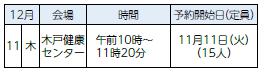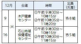 申し込み:9日(火)は健康福祉課地域保健福祉担当(【電話】025-250-2370)、16日(火)は石山地域保健福祉センター(【電話】025-250-2901)