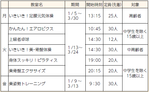 スポーツ 横越総合体育館 冬期(1~3月)スクール参加者募集 6/13 前の記事 次の記事 発行日 : 2025年12月21日 自治体名 : 新潟県新潟市江南区 広報紙名 : 区役所だよりこうなん 令和7年12月21日号 ※開催時間は約1時間 参加費:各回600円(卓球のみ初回時に諸経費支払いあり) 申し込み:同館へ電話(【電話】025-385-4477)で仮予約後、来館して申し込み Tweet シェアする 健康・福祉に関するお知らせ 地域包括支援センターをご活用ください