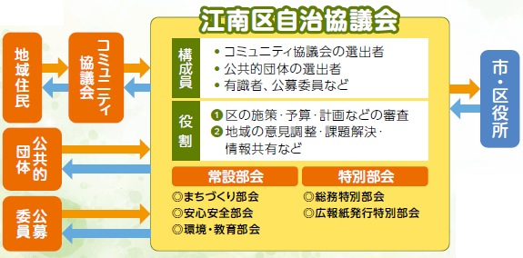 自治協議会は、区の特色を活かしたまちづくりを進めるため、地域と行政をつなぐ「協働の要」として、重要な役割を担っています。