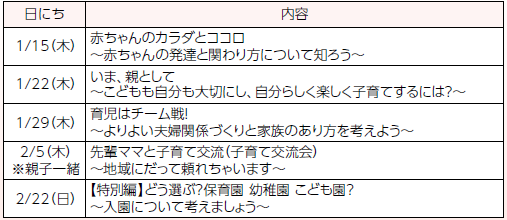 対象・定員:令和7年6~9月生まれのこどもの保護者夫婦 16組(1人での参加も可、応募多数の場合は抽選)保育あり 12人