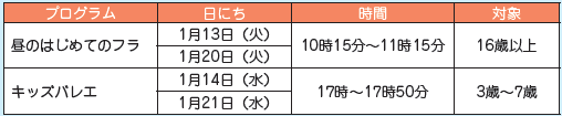 持ち物:動きやすい服装、飲み物(ふた付き)、タオル、厚手の靴下(キッズバレエのみ)