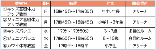 持ち物:動きやすい服装、タオル、飲み物、上履き((1)、(2)、(5)のみ)、厚手の靴下((3)、(4)のみ)