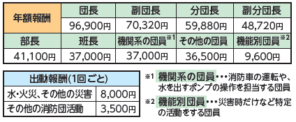 年ごとに支給される報酬や、災害活動・訓練に出動した際の報酬があります。