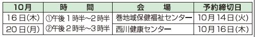 申し込み:各予約締切日までに電話で巻地域保健福祉センター(【電話】0256-72-7100)へ