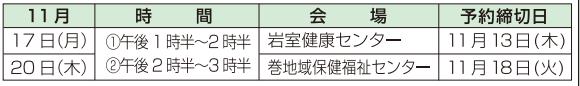 申し込み:各予約締切日までに電話で巻地域保健福祉センター(【電話】0256-72-7100)へ