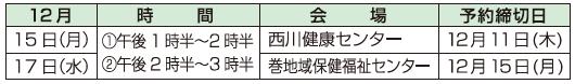 申し込み:各予約締切日までに電話で巻地域保健福祉センター(【電話】0256-72-7100)へ