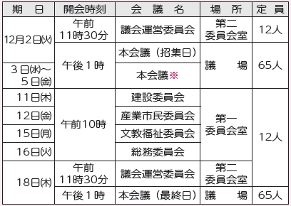 ※3日(水)〜5日(金)の本会議は、一般質問者の人数により日程が短くなる場合があります。