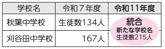秋葉中学校と刈谷田中学校を統合し、令和11年4月に新しい中学校が誕生予定。校舎は令和6年度にバリアフリー工事を行った刈谷田中学校を使用する方針です。